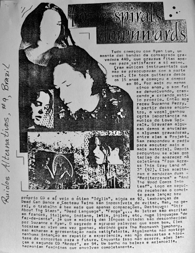 Pretty crazy how people as far away as Brazil know about Love Spirals Downwards. Ruídos Alternativos #9 has a one-page feature on the band. Below is a an English translation as well as the original article.