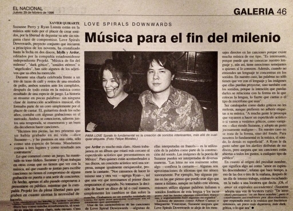 Suzanne Perry and Ryan Lum are in the music scene to enjoy the freedom of creating sounds, and they delegate the pursuit of their art to no one but themselves. Love Spirals Downwards, the creative duo that started on the principle of minimal commitment, has crystallized into two discs. Idylls and Ardor, edited by the independent US label Project, are proof of this. “Music for the end of the millennium,” dark gothic, “ethereal sounds” or “angelical,” are some of the adjectives that their work has earned.