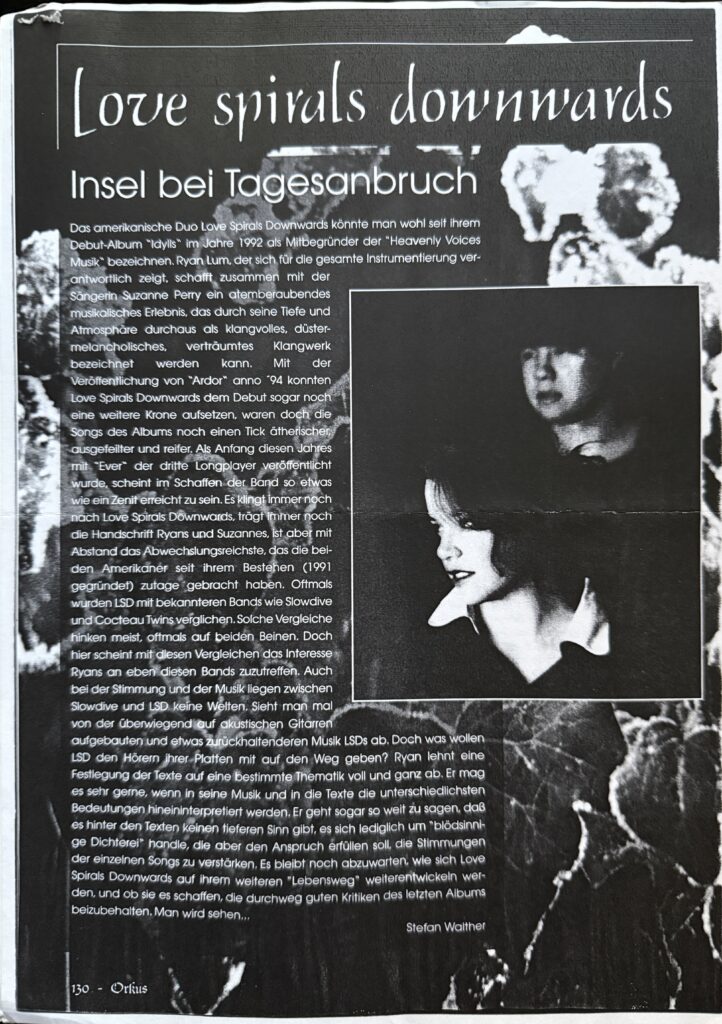 With the release of Ardor in the year ’94, Love Spirals Downwards were able to place yet another crown on their debut, as the songs on the album were a tick more ethereal, polished, and mature. When the third longplayer Ever was released at the beginning of this year [1996], a kind of zenith seems to have been reached in the band’s work. It still sounds like Love Spirals Downwards, still bears the signature of Ryan and Suzanne, but is by far the most varied work the two Americans have brought to light since their existence (founded in 1991).